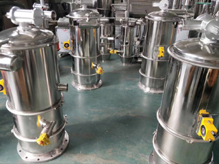 真空上料機輸送過程合理解決了散料在整個輸送過程中粉塵對環境和操作人員造成的汙染問題,消除了輸送過程中的靜電感應。磨擦在整個運輸過程中。運用氣動吸脂法的基本原理來輸送散料,避免了整個輸送過程中物料的阻塞和泄漏。此外,本發明使真空泵實現密封輸送散狀物料的方法之一,在整個生產過程中能合理地解決其分層問題。適應了現代工業發展的要求。 一.生產流程: 材料由雙錐形幹燥機送進,並與專用接頭連接,用於粉狀設備的運輸。原料經特殊管道送入化工粉末真空上料係統,經真空上料機輸送到料倉。關掉料倉正下麵的風機及轉